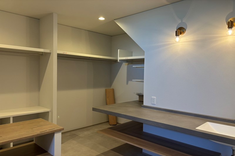 さらに、L字型のアイカ工業の造作洗面台も見どころのひとつ。