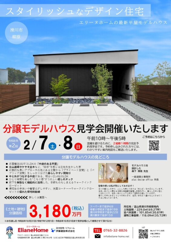 また、こちらの「平屋柳原モデルハウス」の見学会も2月に開催いたします。