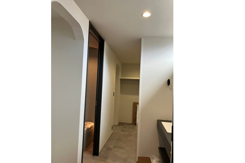 玄関クロークには家族それぞれの荷物棚を設け、そのそばにはアイカ洗面化粧台、その先にはファミリークローゼットと、自然と動線が繋がる。